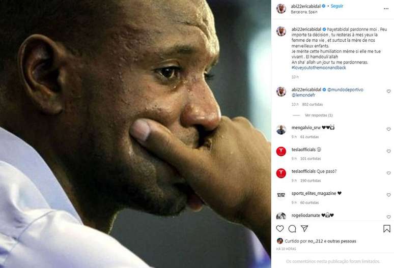 A mensagem de Abidal é também uma resposta à publicação de Hayet em sua conta no Instagram na última segunda-feira. "Nós perdoamos, até que algo entre em colapso em você, você não sinta mais nada, nem perdão, nem raiva, mas apenas o desejo de virar a página e pensar outra coisa", diz o texto.