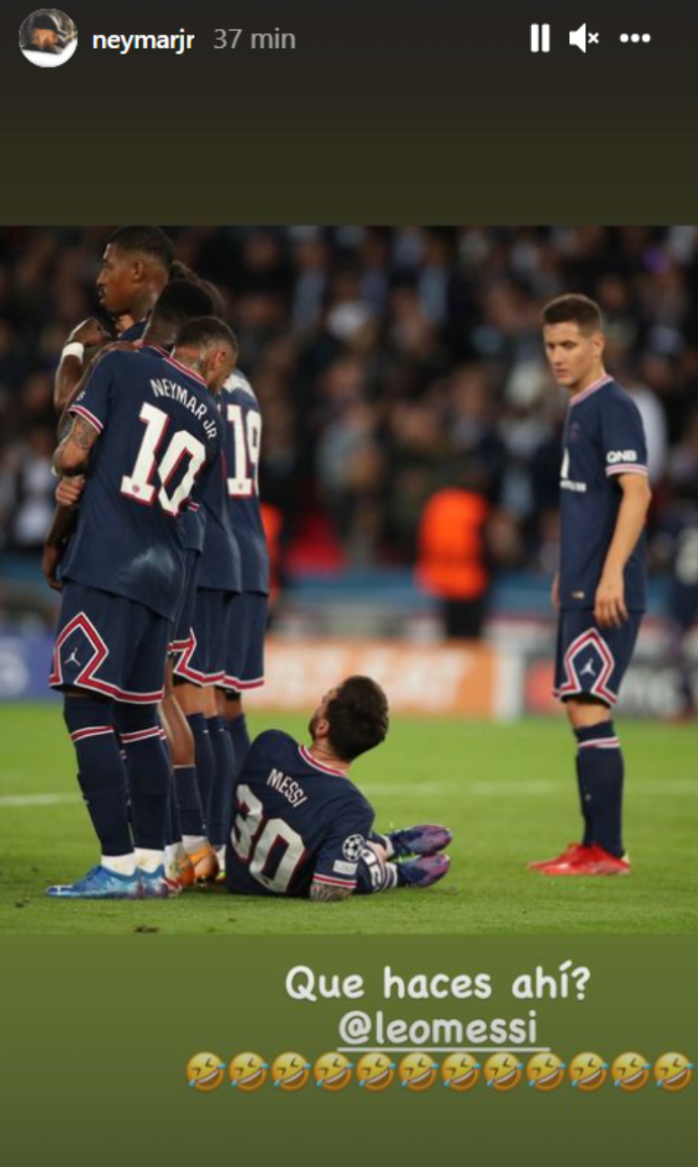 Além da foto do trio de ataque, o camisa 10 do PSG aproveitou para publicar outra em que Messi aparece deitado atrás da barreira da equipe. Amigos desde a época de Barcelona, Neymar brincou com a situação.
