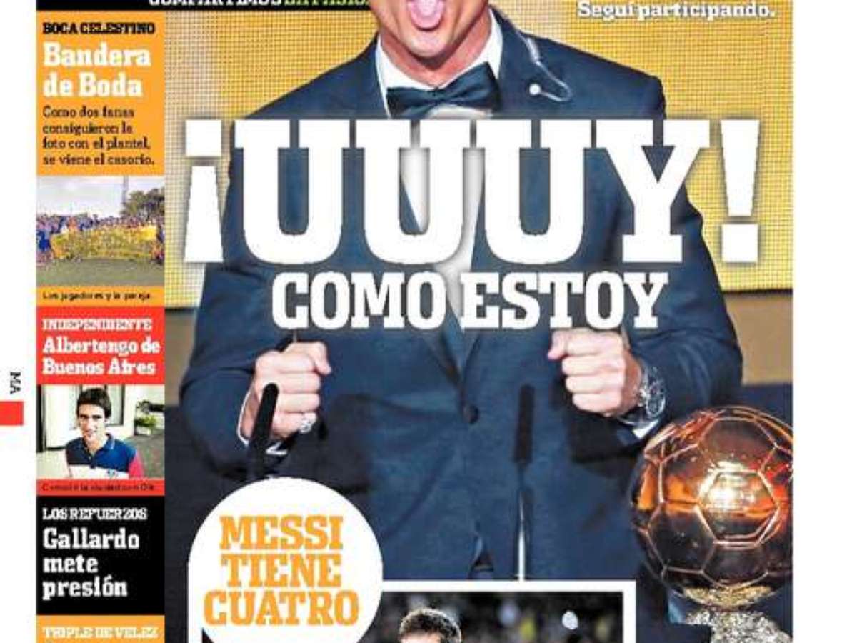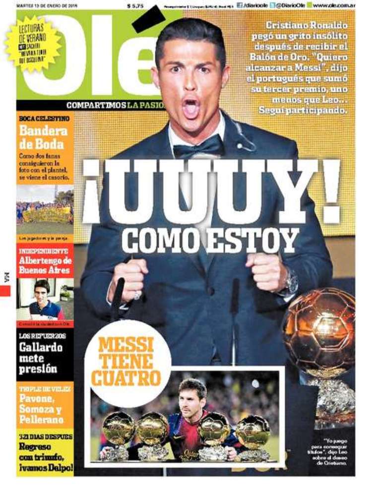 O Olé também destacou a declaração de CR7 em que o astro do Real Madrid diz que quer alcançar Lionel Messi, que possui quatro Bolas de Ouro (2009, 2010, 2011 e 2012) contra três do rival (2008, 2013 e 2014). "Siga participando", aconselhou o jornal a Cristiano, com uma imagem de Messi e seus quatro prêmios logo abaixo.