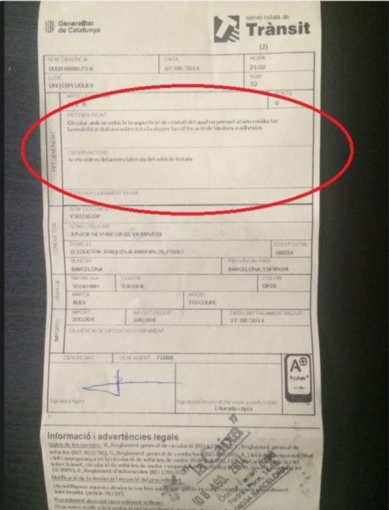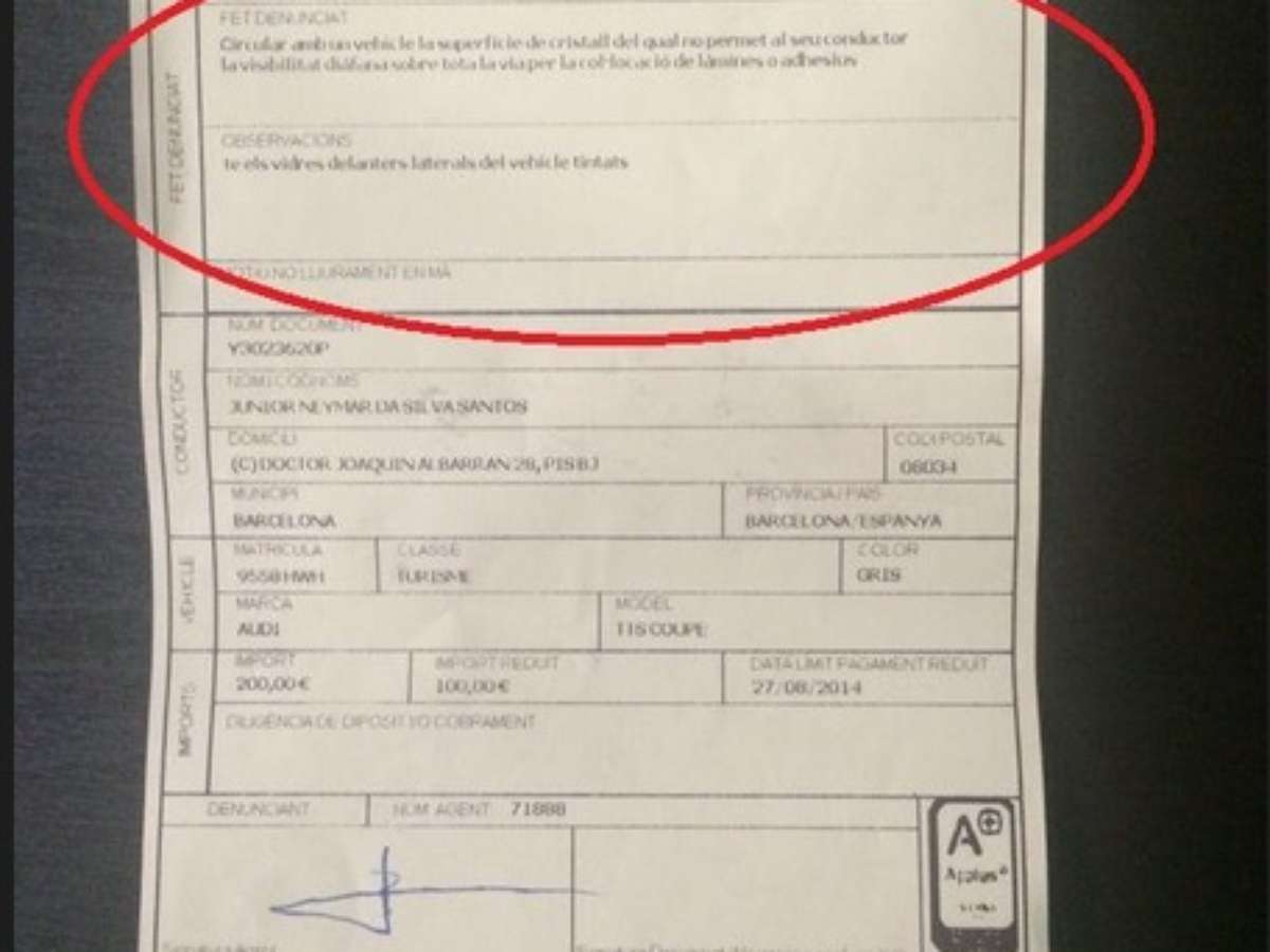 Acusado de ter sido multado por dirigir com excesso de velocidade nas ruas de Barcelona nos últimos dias, Neymar foi às redes sociais para esclarecer qualquer tipo polêmica. Entretanto, mostrou desconforto. Por meio de sua página oficial no Twitter, o craque compartilhou uma nota de seu site ofical, na qual expõe o documento e revela ter sido notificado por ter o carro com o vidro muito escuro.