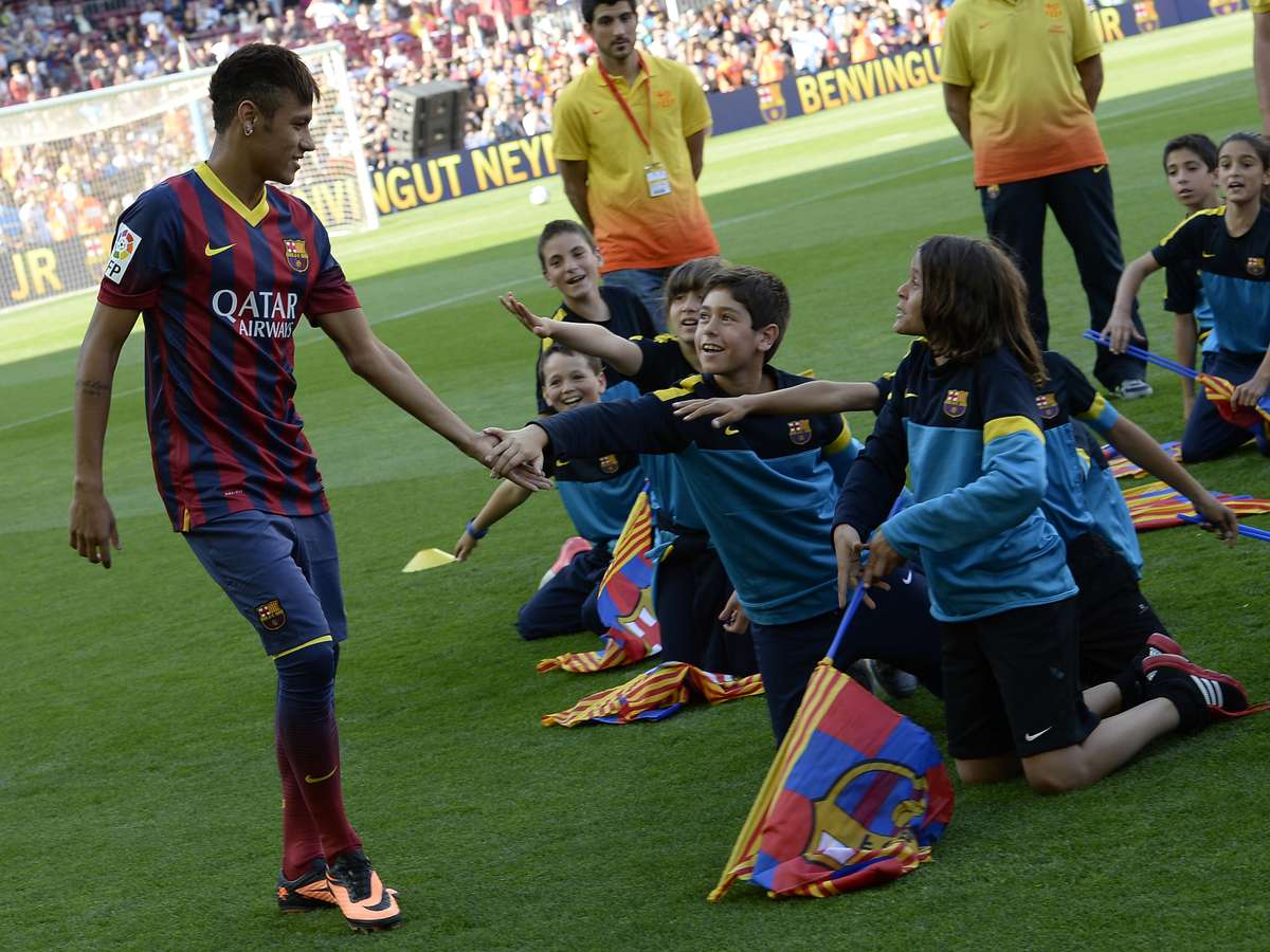 Neymar foi ovacionado pelo bom público no Camp Nou e arriscou palavras em catalão para dizer que estava emocionado por realizar o sonho de jogar pelo Barcelona. O ex-atacante do Santos fez embaixadinhas em um palco montado no gramado e depois distribuiu bolas para os torcedores nas arquibancadas. Nesta terça, ele retorna para o Brasil e se reúne com a Seleção, que se concentra em Goiânia para a Copa das Confederações.