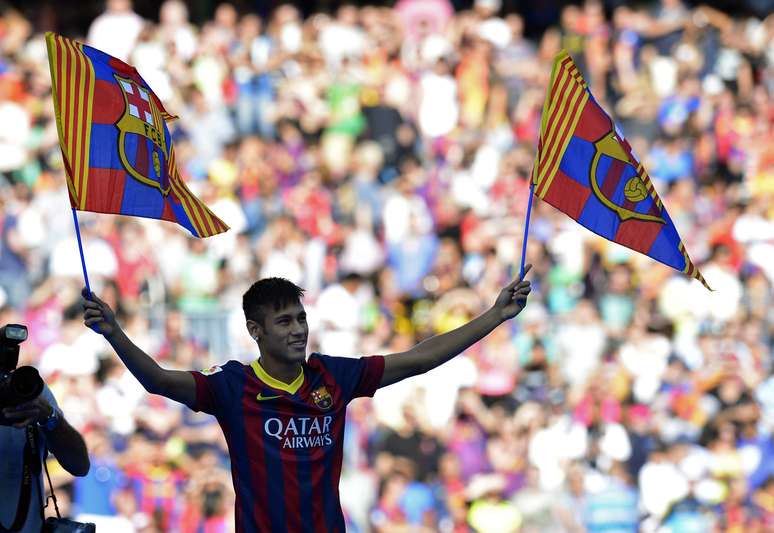 Neymar foi apresentado nesta segunda-feira como novo jogador do Barcelona, e chegou com status de astro no Camp Nou. Em uma grande festa montada para o ex-santista no estádio do Barcelona, o atacante subiu ao gramado em um tapete azul e saudou em cima de um palco montado no centro do campo os 56.500 torcedores (segundo o site oficial do clube) que compareceram para recebê-lo.