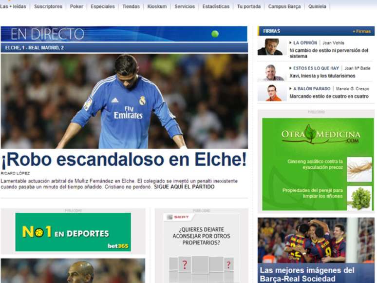 A forma polêmica como o Real Madrid conseguiu a vitória por 2 a 1 sobre o Elche, em partida do Campeonato Espanhol, causou revolta e críticas na imprensa local nesta quarta-feira. O pênalti duvidoso nos acréscimos que definiu o resultado foi classificado como "roubo", "confusão" e ironizado nas manchetes dos principais jornais espanhóis.