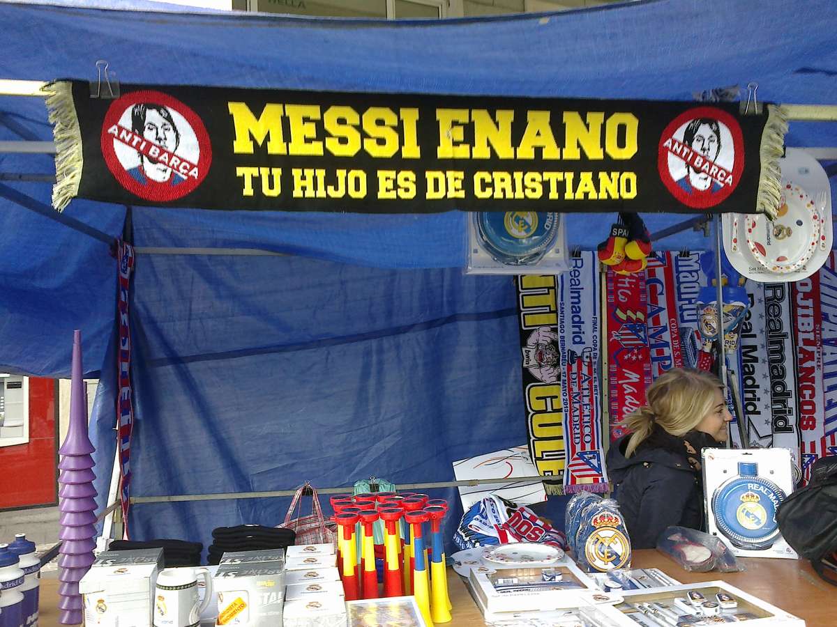 A final da Copa do Rei de 2013 será entre Real Madrid e Atlético de Madrid, a partir das 16h30 (de Brasília) desta sexta-feira. Mas nos arredores do Santiago Bernabéu, palco da decisão, os vendedores não se esquecem do Barcelona. As muitas tendas em volta do estádio, que vendem souvenires e faixas dos clubes finalistas, incluem até uma provocação direta a Lionel Messi, craque da equipe catalã com os dizeres: "Messi enano, tu hijo es de Cristiano" ("Messi anão, seu filho é de Cristiano").