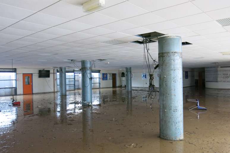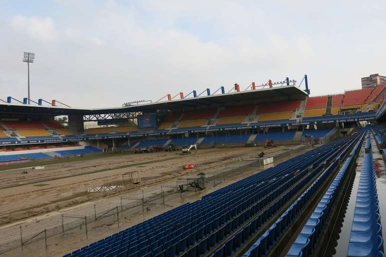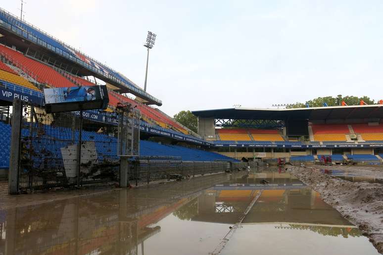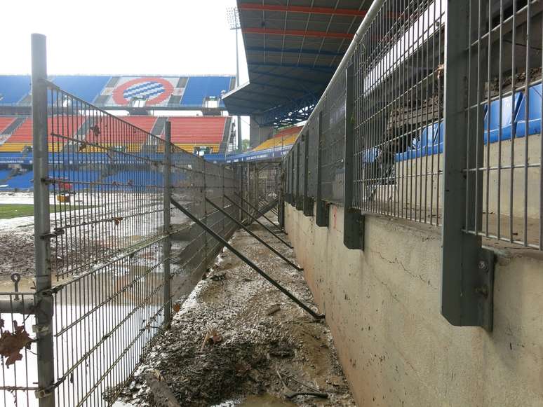 O estádio, que tem capacidade para 50 mil pessoas, foi devastado pelas fortes chuvas. Tanto os vestiários como a arquibancada, o campo e as salas internas foram danificados. Nas imagens, é praticamente impossível identificar onde está o gramado.