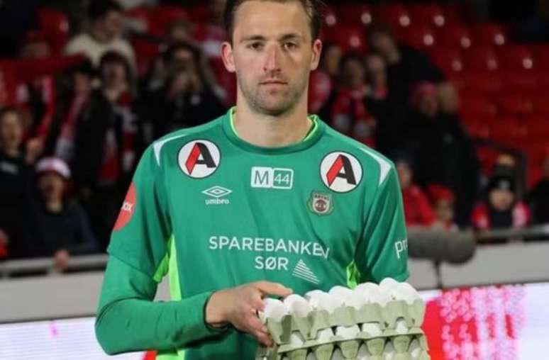 Jan de Boer, do Bryne, recebeu os ovos como prêmio de 'melhor da partida' após defender um pênalti na etapa final, no Campeonato Norueguês