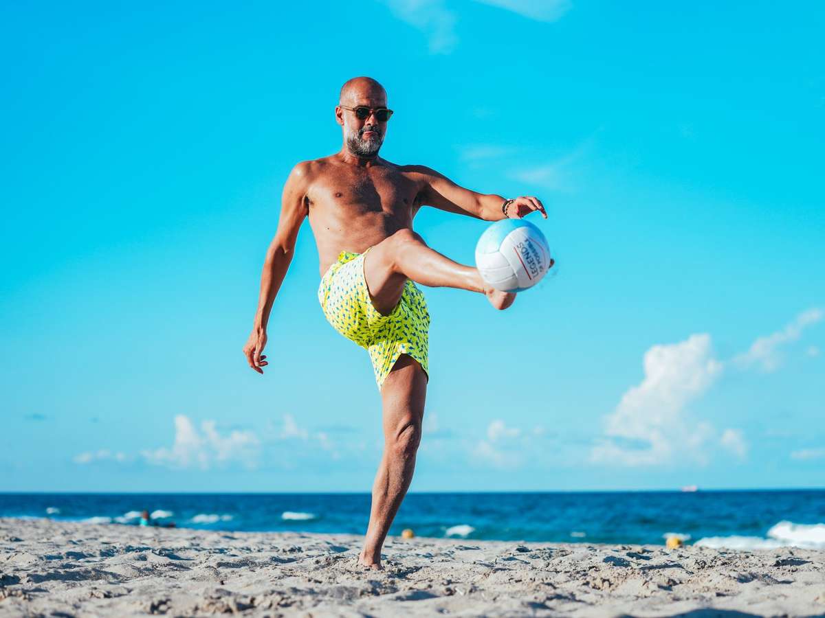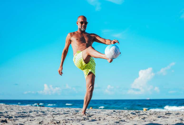 Guardiola participa de altinha na praia com o elenco do Manchester City