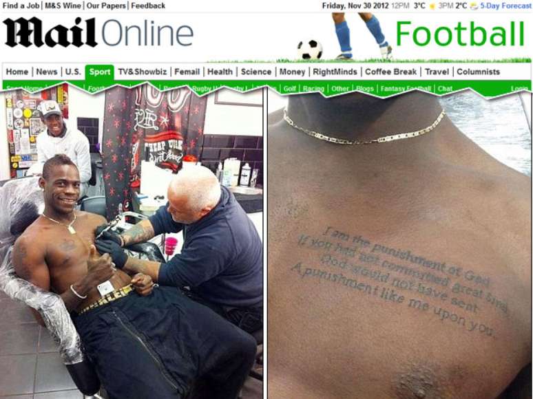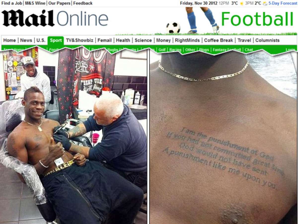 Balotelli resolveu fazer a nova tatuagem após marcar seu primeiro gol no Campeonato Inglês de 2012/2013. Ele balançou as redes na vitória por 2 a 0 do Manchester City, fora de casa, no DW Stadium, sobre o Wigan Athletic, na última quarta-feira. O meia inglês James Milner marcou o outro gol do City, que é o vice-líder da competição com 32 pontos, contra 33 do Manchester United.