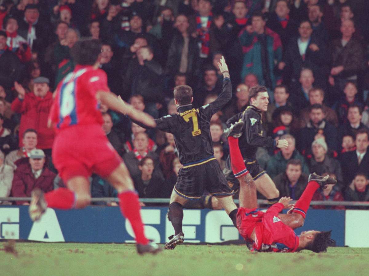 O lance ocorreu aos 48min do segundo tempo. Em chutão do goleiro, Cantona envolveu-se em atrito com o zagueiro Richard Shaw. Na correria da disputa da bola, o adversário caiu no chão e causou grande reação nos torcedores no estádio, que forçaram imediatamente o juiz a paralisar a partida.