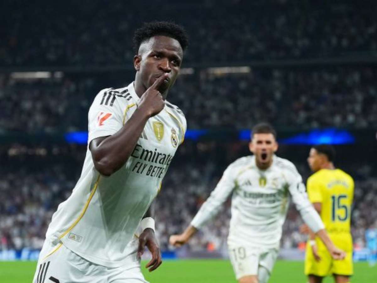 Dizem que Vini Jr. está apaixonado e com a vida amorosa bem resolvida. O momento fica, então, mais leve. Em campo, a fase conjugal do craque se refletiu no placar da vitória do Real Madrid sobre o Villarreal por 3 a 1, neste sábado (4), no Estádio Santiago Bernabéu, pela rodada 8 do Campeonato Espanhol. A fera merengue marcou dois gols da vitória. Agora terá que pagar o jantar de sua donzela (leia mais detalhes abaixo). Os Blancos lideram a La Liga, com 21 pontos. O Submarino Amarelo está em terceiro lugar, com 16.
