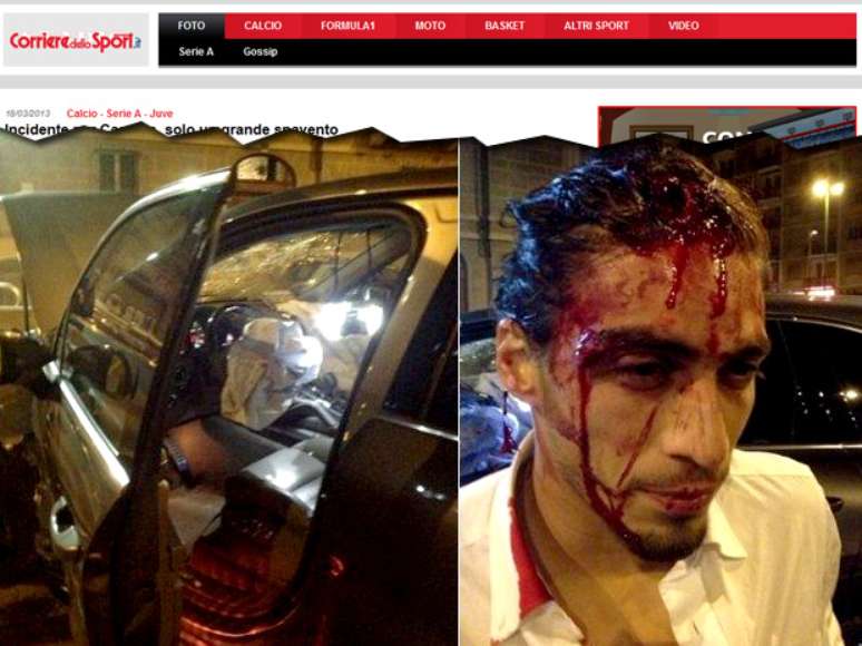 O jornal italiano Corriere dello Sport publica nesta segunda-feira uma foto do acidente envolvendo o defensor uruguaio Martín Cáceres, da Juventus. Na imagem, o jogador deixa seu carro após uma forte batida em Turim e exibe rosto bastante ensanguentado. O incidente ocorreu na madrugada de domingo.