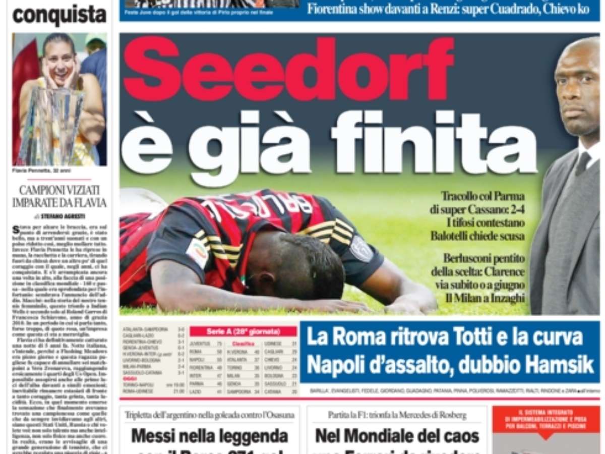 Seedorf encerrou a carreira no Botafogo, no final de 2013, e aceitou comandar o Milan até junho de 2016. A permanência, no entanto, é altamente contestada na Itália. “Cabe a ele mostrar que merece continuar”, diz o Corriere dello Sport.