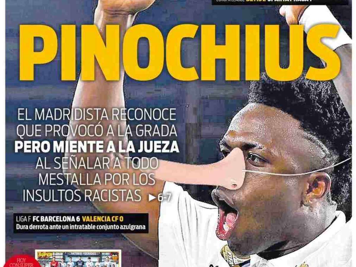 O Valencia já declarou guerra a Vini Jr. E a imprensa da cidade embarcou, sobretudo, no discurso do clube. Nesta sexta-feira (6), o jornal "Super Deporte", ofendido com o depoimento do jogador merengue sobre racismo, chama, em sua capa, o craque brasileiro de "Pinóquio".