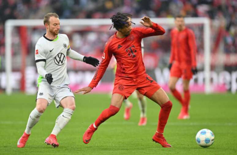 Foto: Sebastian Widmann/Getty Images - Legenda: Olise domina a bola para o Bayern diante da marcação do Wolfsburg / Jogada10