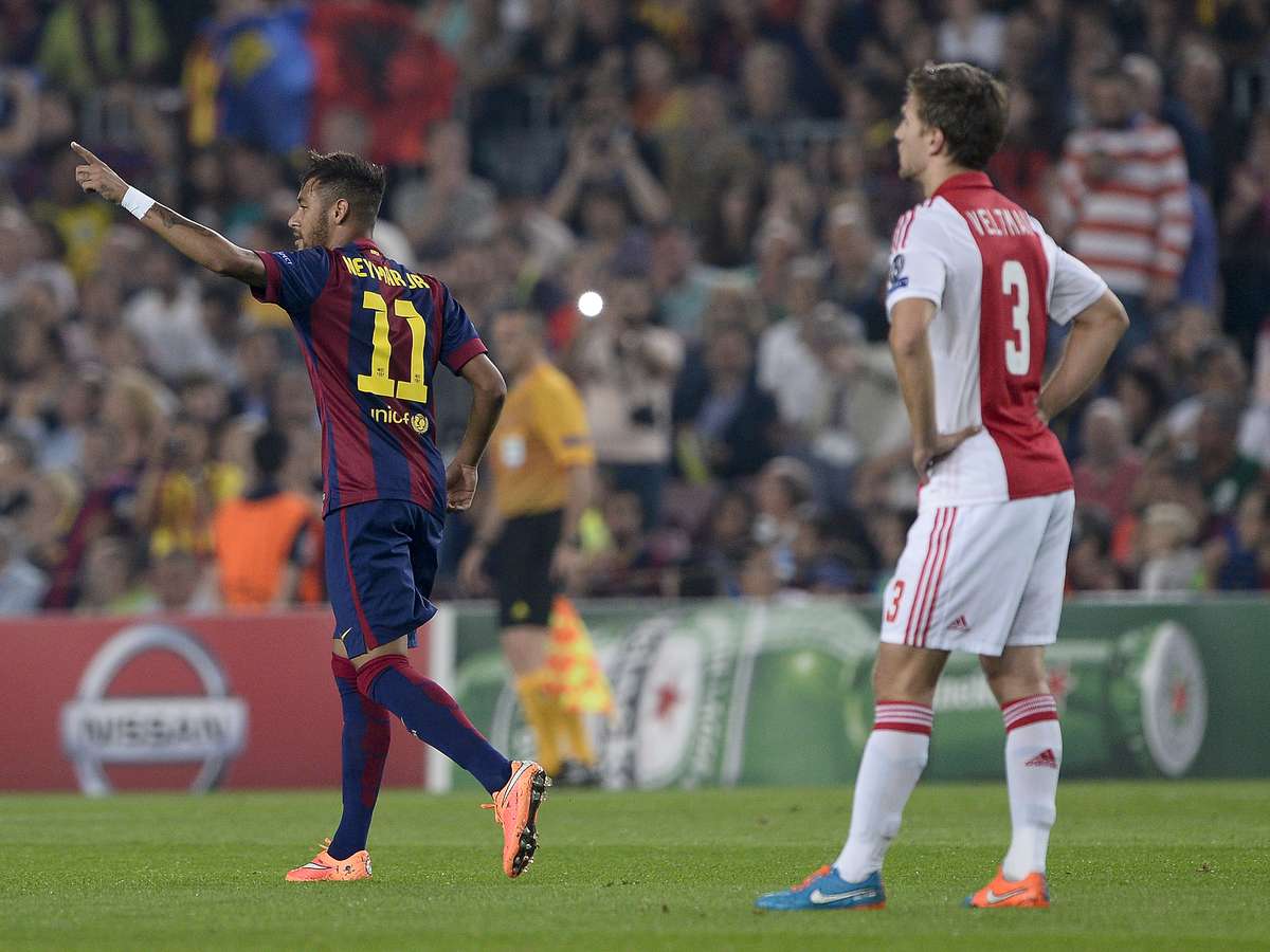 Em excelente fase pelo Barcelona, Neymar prepara o chute no lance que abriu o placar no duelo contra o Ajax.