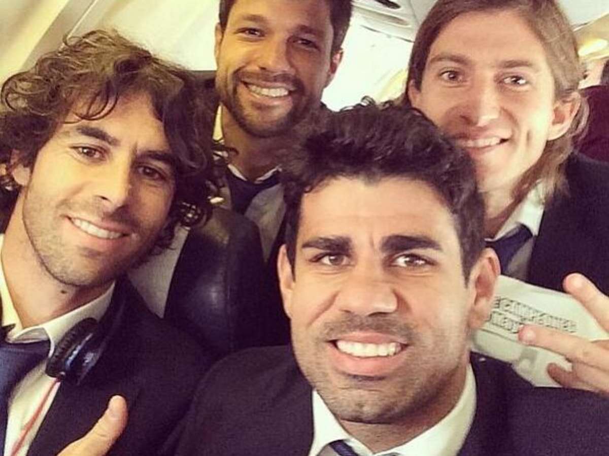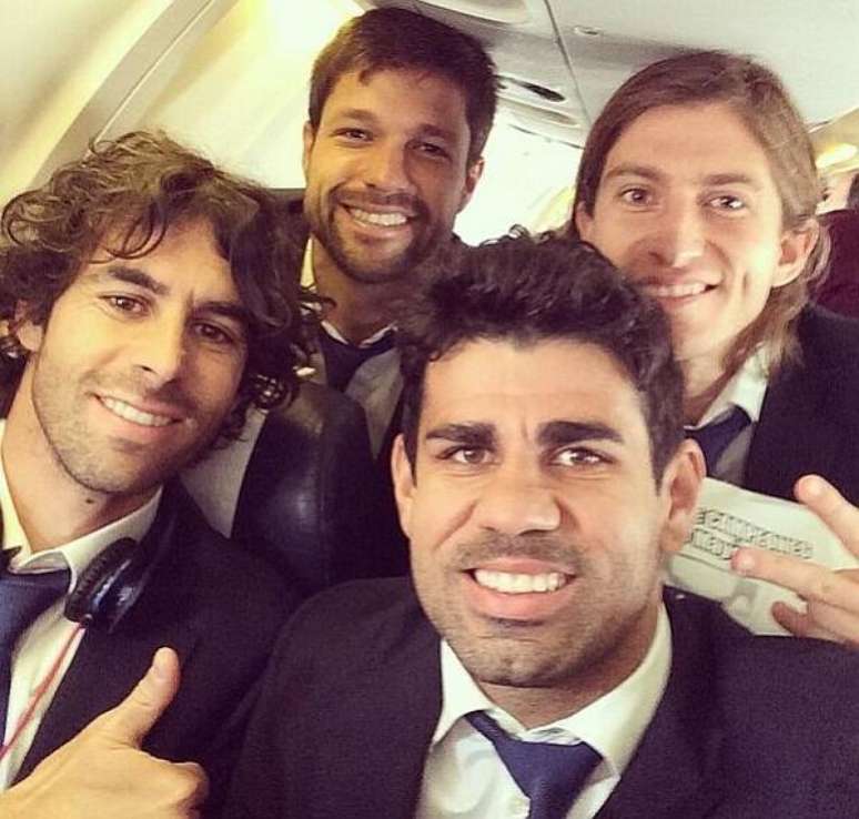 No avião, Diego Costa fez uma "selfie" com os brasileiros Filipe Luis e Diego Ribas e o português Tiago
