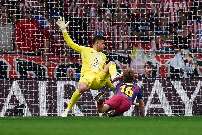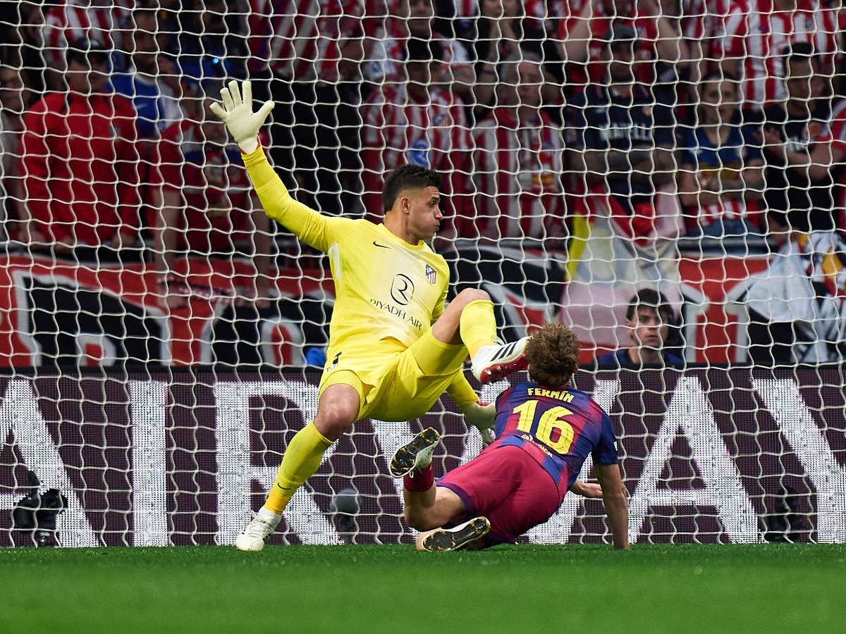 PREOCUPAÇÃO! No choque com Musso, Fermín Lopez se machucou feio… O pé do goleiro do Atleti acertou o rosto do jogador do Barça.