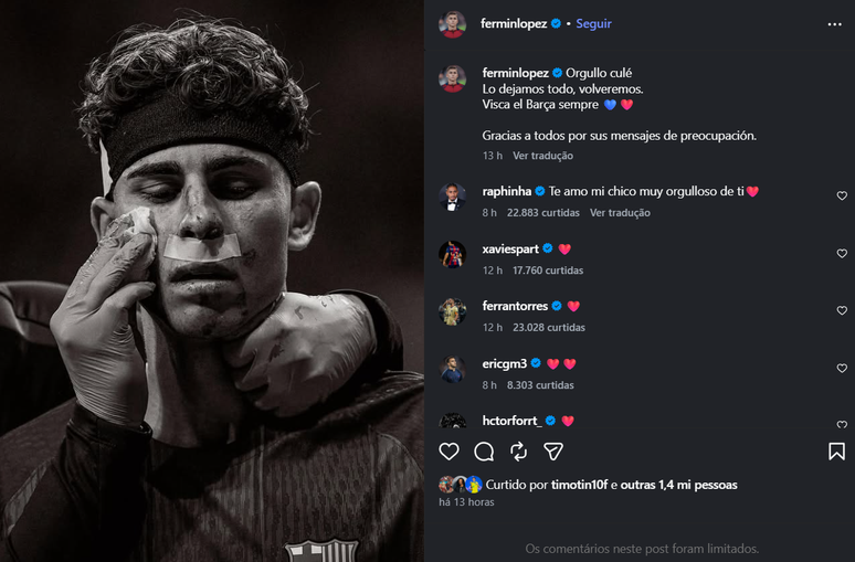 Apesar da vitória por 2 a 1, o Barcelona acabou eliminado no placar agregado por 3 a 2. O jogador agora deve permanecer em repouso para evitar infecções, encerrando uma semana marcada por mais um problema físico, já que também havia sofrido um corte na testa. Ele publicou um registro em suas redes demonstrando como ficou seu rosto após o choque. Veja abaixo: