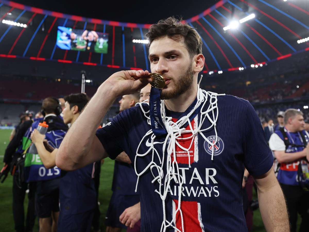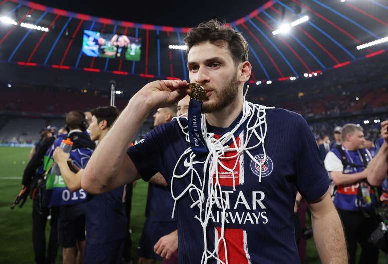Após a goleada por 5 a 0 sobre a Internazionale, neste sábado (31), que garantiu ao Paris Saint-Germain a conquista inédita da Champions League, o atacante Khvicha Kvaratskhelia celebrou o título.