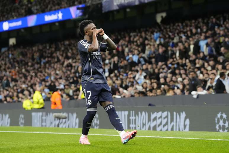 Autor dos dois gols da vitória sobre os Citizens, Vinícius Jr mandou o tradicional 'chororô' para a torcida do time inglês ao abrir o placar no Ettihad Stadium. O brasileiro também pediu silêncio, e colocou o dedo em riste sobre os lábios.