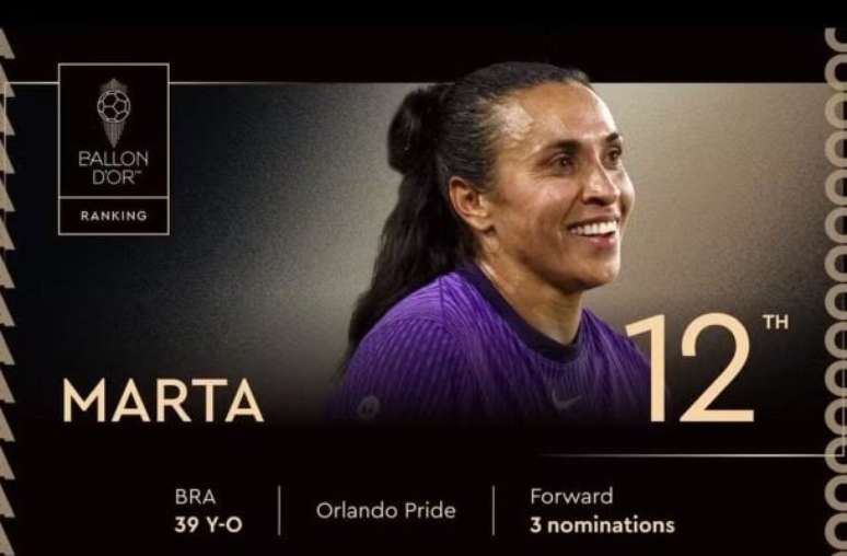 Aos 39 anos, Marta retornou à lista da Bola de Ouro após seis anos. Aliás, na última temporada, ela conquistou o título da NWSL com o Orlando Pride, foi vice-artilheira da competição e venceu a Copa América Feminina com a Seleção Brasileira, sendo eleita a melhor jogadora do torneio e decisiva na final contra a Colômbia.