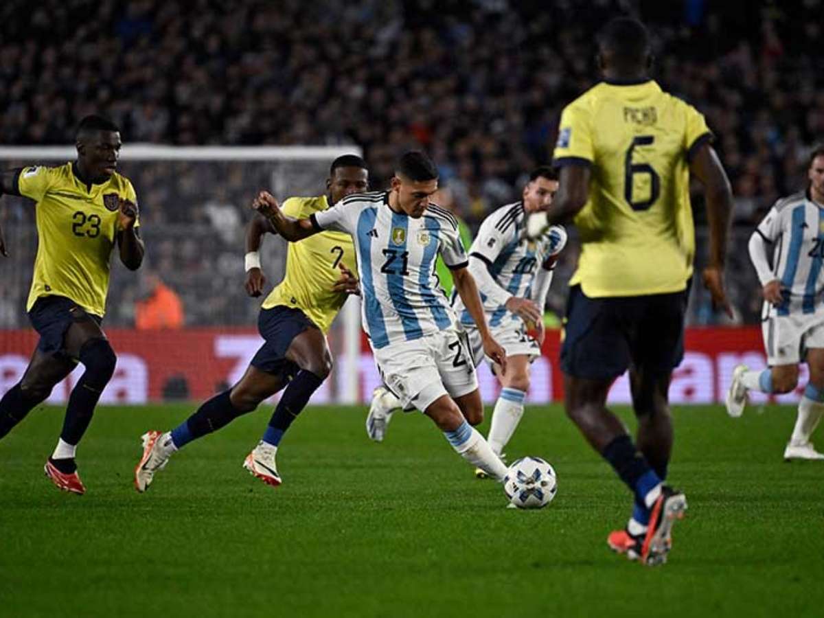 A Argentina iniciou o duelo em cima do Equador, mas o volume de jogo não foi suficiente para quebrar a marcação do adversário. Com um troca de passes mais veloz, a albiceleste até assustou em chute de Messi, que passou rente ao poste. No último lance da etapa inicial, Lautaro Martínez recebeu cruzamento e desviou. A bola explodiu na trave e a zaga equatoriana afastou.