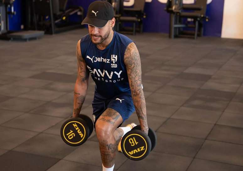 Nas fotos, o jogador aparece realizando movimentos com pesos no CT do clube saudita.