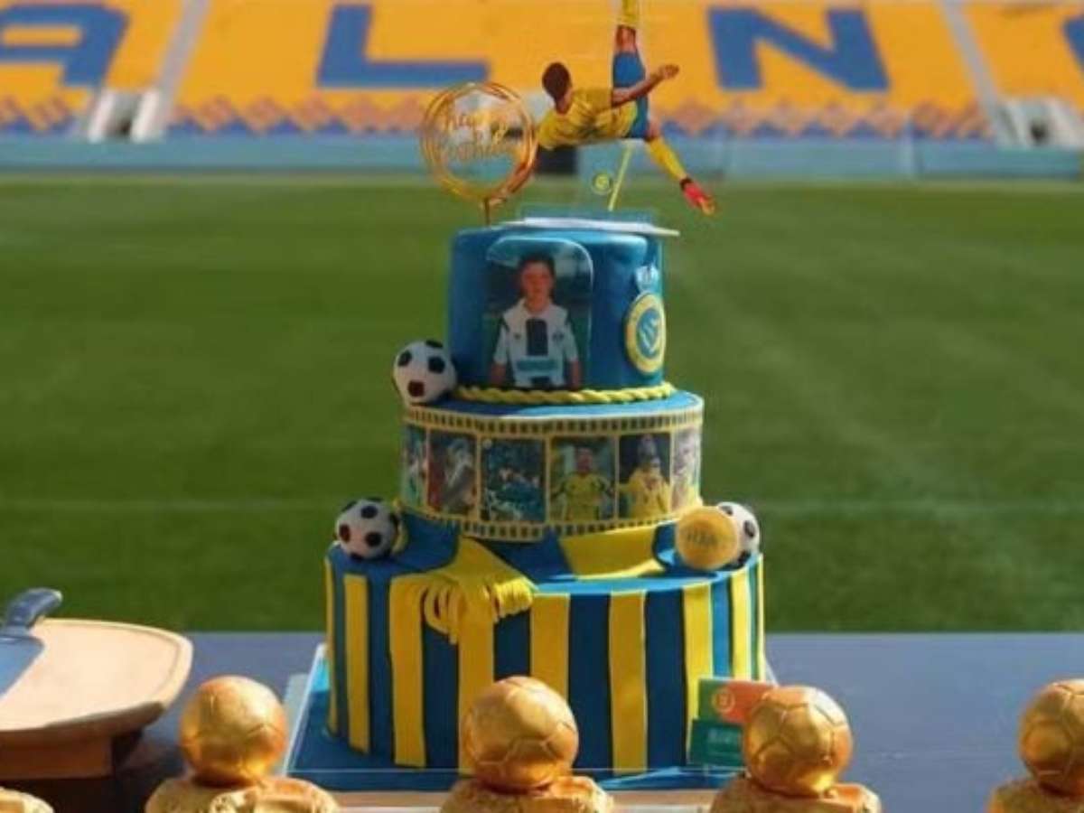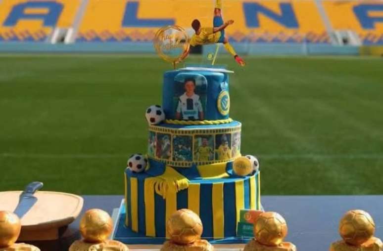 O craque Cristiano Ronaldo completou nesta quarta-feira (05) 40 anos e recebeu uma homenagem especial do Al-Nassr, seu atual clube, com um bolo gigante. O bolo trazia imagens personalizadas da carreira do português e um boneco sobre doces em formato das cinco Bolas de Ouro conquistadas pelo camisa 7.
