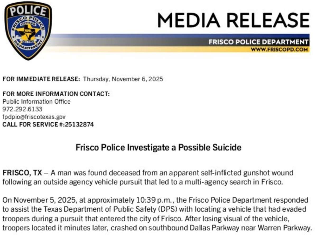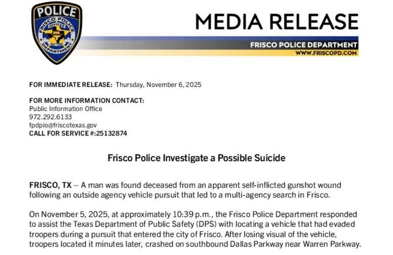 "Em 5 de novembro de 2025, aproximadamente às 22h39, o Departamento de Polícia de Frisco respondeu a um pedido de assistência do DPS para localizar um veículo que havia fugido de uma abordagem. Depois de perder o contato visual, os policiais localizaram o carro minutos depois, colidido na Dallas Parkway, sentido sul, próximo à Warren Parkway", informou a Policia, através do comunicado.