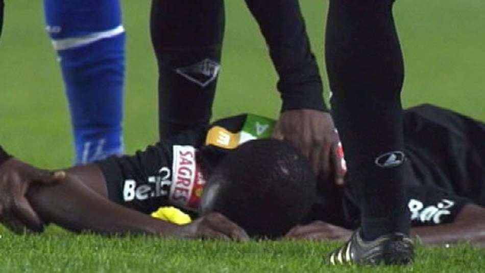 Campeonato Português Após choque de cabeça, jogador desmaia em campo Exibir comentários Compartilhar Sougou, jogador da Académica fica desacordado por algum tempo depois de cabeçada com zagueiro do Porto; após o susto, atleta volta ao campo normalmente Campeonato Português Publicidade