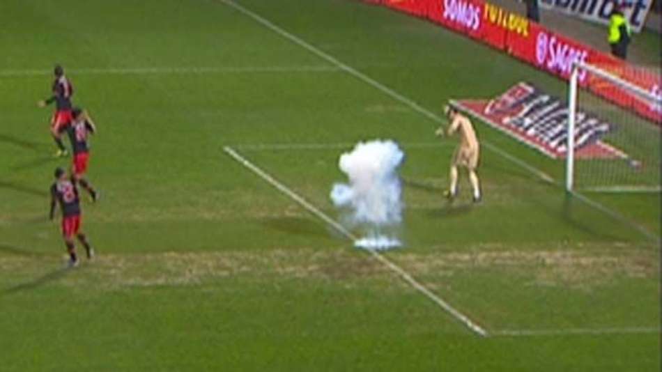 Campeonato Português Torcida joga bomba no campo e quase acerta brasileiro Exibir comentários Compartilhar A torcida do Vitoria Guimaraes jogou uma bomba na direção do goleiro do Benfica, Artur; o Benfica venceu o jogo por 3 a 0 Terra Publicidade