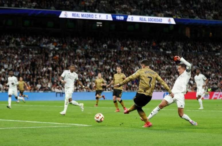 A Real Sociedad surpreendeu e fez uma grande partida no Santiago Bernabéu. Logo aos 15 minutos, Barrenetxea abriu o placar, mostrando que os visitantes estavam ligados no jogo. O Real Madrid, porém, reagiu. Com um lindo passe de trivela de Vini Jr, Endrick tocou por cobertura e deixou tudo igual.