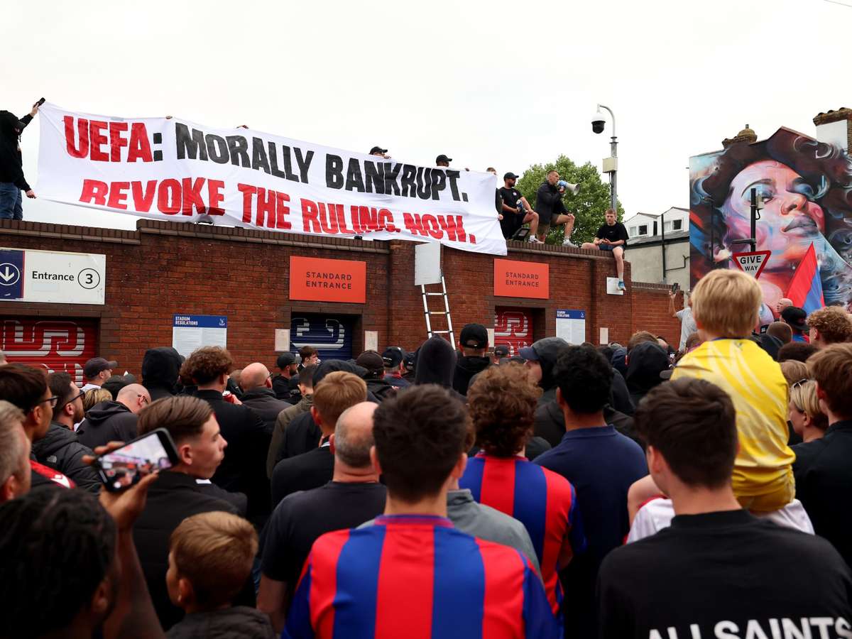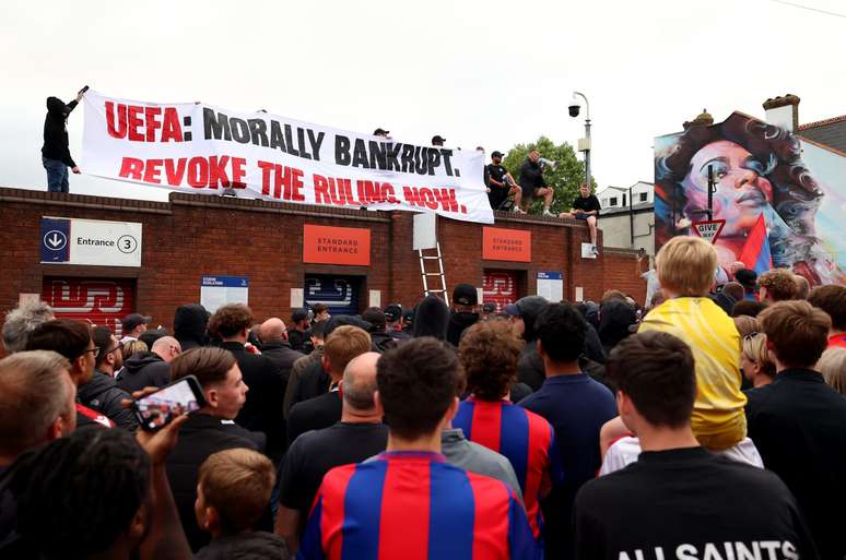 Torcedores do Crystal Palace protestam nos arredores do estádio Selhurst Park, nesta quarta-feira (16) contra a decisão da Uefa de excluir a equipe da próxima Liga Europa. A manifestação foi pacífica e foi organizada pelo grupo de ultras Holmesdale Fanatics.