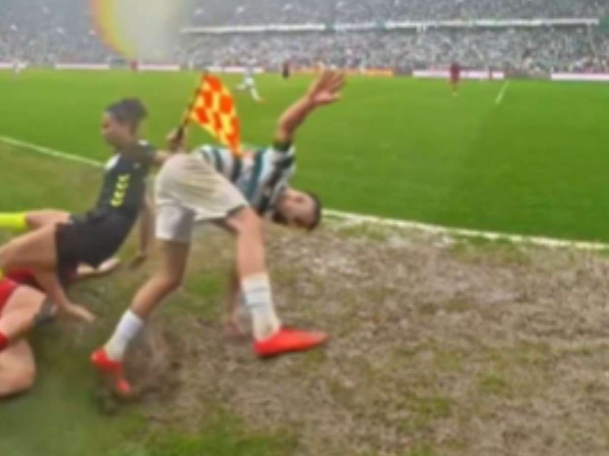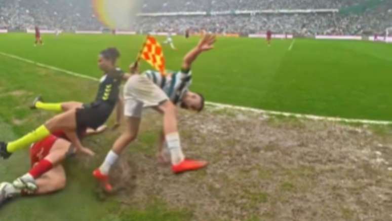 Bandeirinha é derrubada por jogadores em jogo na Turquia e não recebe ajuda para levantar