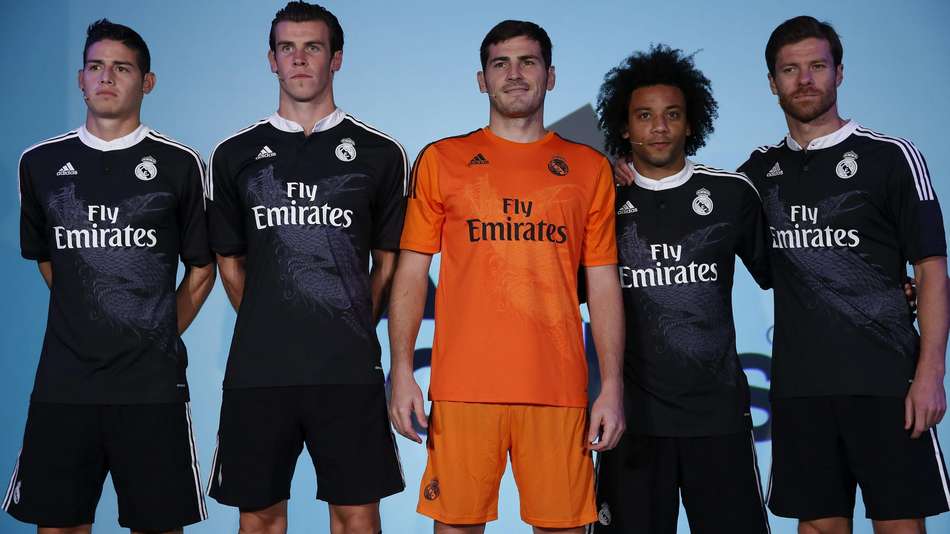 Futebol Internacional Real Madrid lança camisa preta com desenho de dragão Exibir comentários Compartilhar Brasileiro Marcelo e outros astros do time como Casillas e Bale participaram da cerimônia para mostrar o novo e estiloso uniforme Reprodução Publicidade