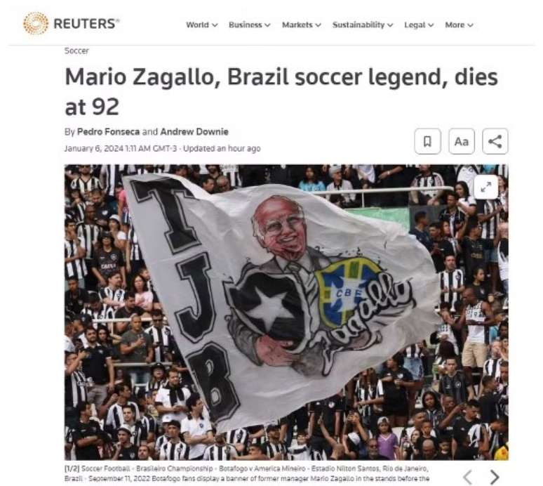 O jornal A Bola, de Portugal, foi um dos primeiros veículos que noticiaram o falecimento de Zagallo, e destacou que o brasileiro foi "bicampeão mundial como jogador, em 1958 e 1962, campeão como treinador, em 1970, e como coordenador técnico, em 1994, o brasileiro foi uma das maiores lendas da história do jogo".