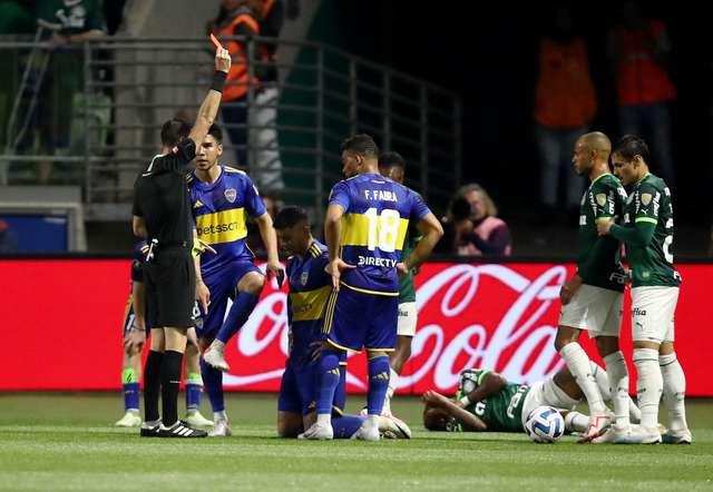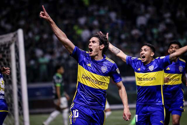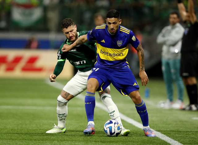 O Boca, que manteve Merentiel e Cavani no ataque, se fechou bem no campo de defesa e buscou sair em velocidade para surpreender e assim saiu o gol. Merentiel se aproveitou de erro da defesa palmeirense, ganhou na velocidade de Gustavo Gómez e cruzou para Cavani completar de carrinho para o gol. (Foto: Reuters)