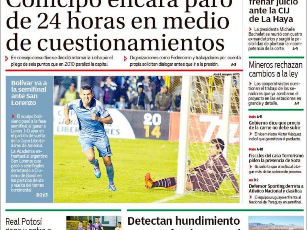 A histórica classificação do Bolívar para as semifinais da Copa Libertadores da América de 2014 é destaque nas capas de jornais bolivianos nesta sexta-feira. Embora não haja euforia, as manchetes de alguns dos principais veículos trazem o time de Xabier Azkargorta.