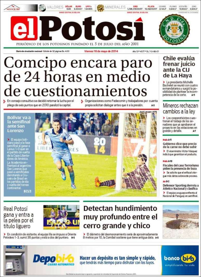 Também na Bolívia, o El Potosí adota um tom discreto em sua manchete fotográfica. “Bolívar vai à semifinal diante do San Lorenzo”, publica o diário, lembrando da classificação do time de Almagro contra o “Cruceiro”.