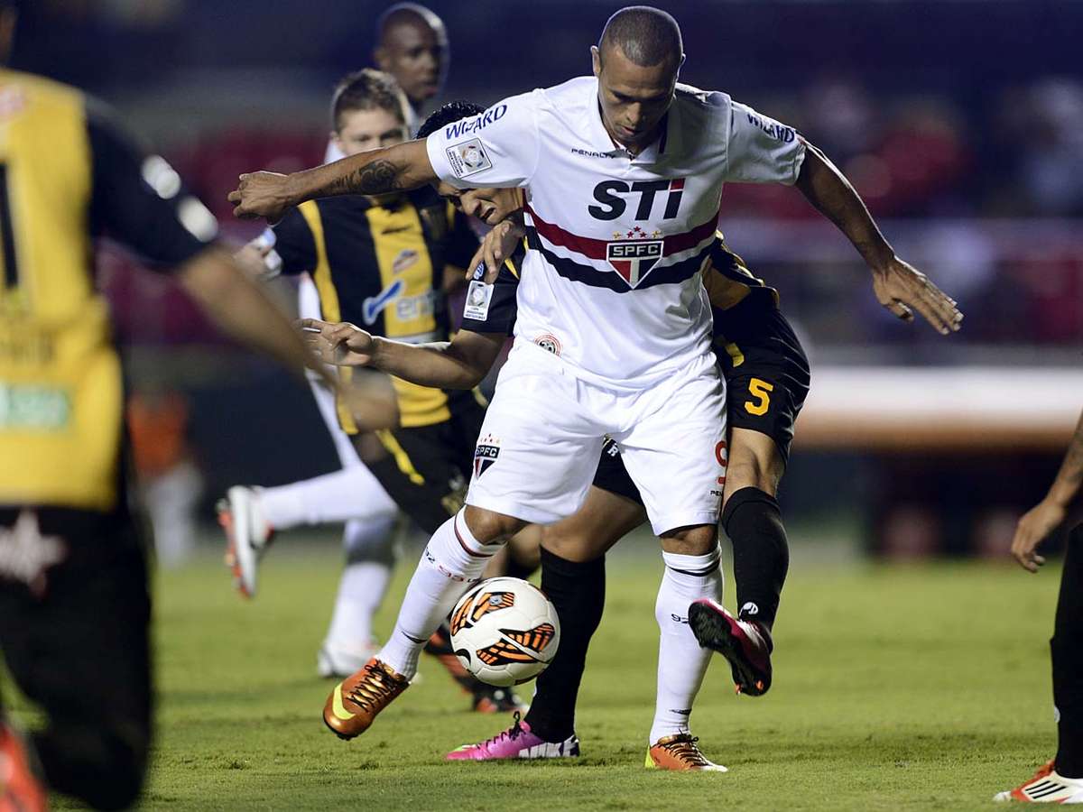 Luís Fabiano aproveitou passe de Ganso em jogada de Cañete para definir vitória no Morumbi e definir a vitória por 2 a 1 sobre o Strongest, da Bolívia; veja imagens