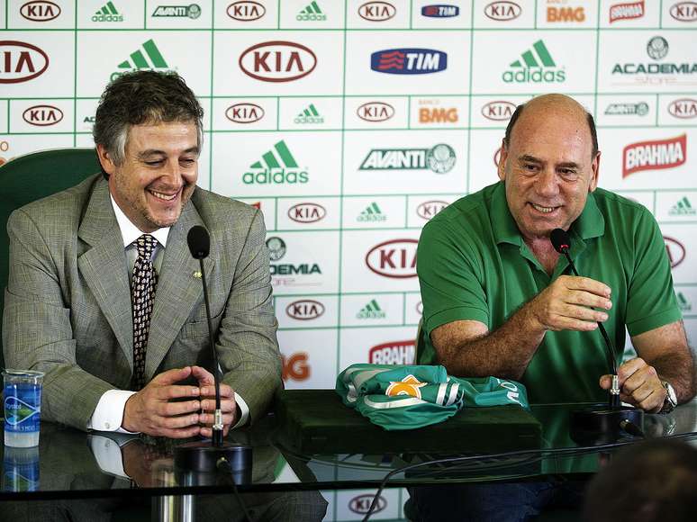 Novo presidente do Palmeiras, Paulo Nobre (à dir.) participou da apresentação do dirigente e aproveitou a ocasião para anunciar que o meia argentino Juan Román Riquelme não será contratado pelo clube