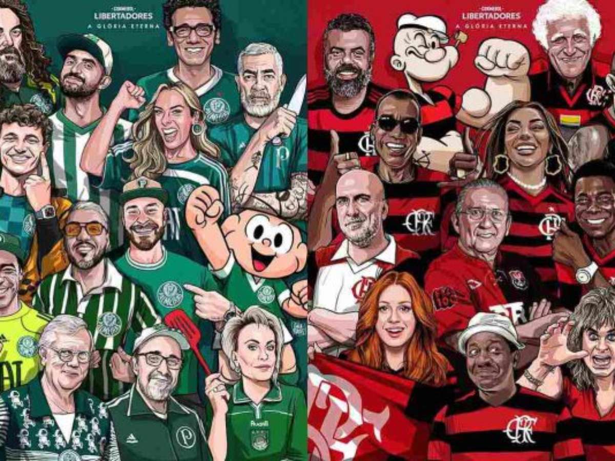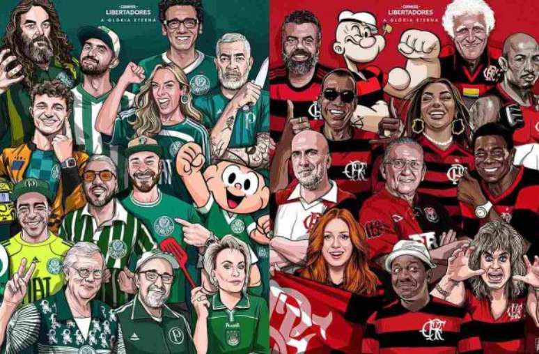 A Conmebol divulgou uma divertida arte que ilustra torcedores famosos do Palmeiras e do Flamengo. Assim, a entidade que representa o futebol na América do Sul, reuniu nomes que são historicamente associados à torcida, inclusive pessoas que já morreram. Mas também fez uma brincadeira ao incluir personagens de desenhos animados. Desse modo, Cebolinha, da Turma da Mônica criada por Maurício de Sousa, aparece na torcida do Verdão, enquanto Popeye reforça o coro dos rubro-negros.