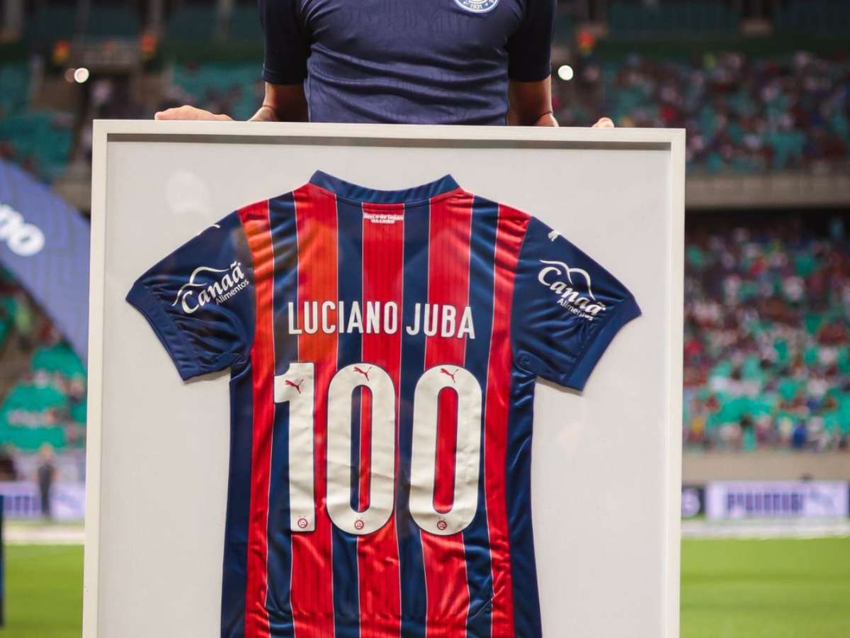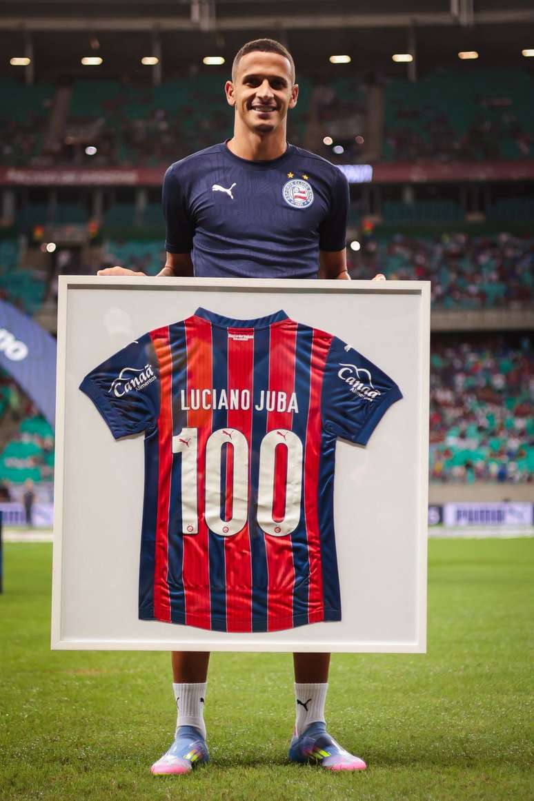 Luciano Juba é um dos destaques do Bahia na temporada, e neste sábado (3) o lateral foi homenageado pelo clube pelos 100 jogos disputados com a camisa tricolor. O marco foi atingido no duelo contra o Paysandu, pela Copa do Brasil, mas a homenagem aconteceu diante da torcida, na Arena Fonte Nova, antes da partida contra o Botafogo, pelo Brasileirão.