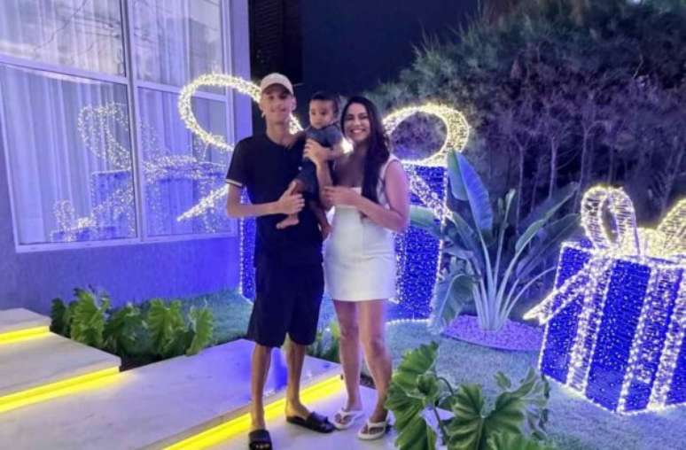 Luva de Pedreiro e a namorada Távila Gomes já se preparam para o primeiro Natal juntos. O casal já decorou a fachada da nova residência com a temática da festividade. Assim, o influenciador e a companheira posaram ao lado do primeiro filho, Davi, na fachada da residência.