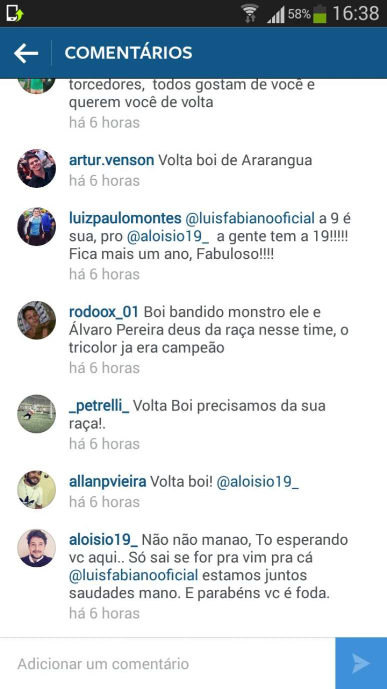 Aloisio recebeu o comentário de Luís Fabiano com surpresa e respondeu: "não, não mano. Só sai se for pra vim pra cá. Estamos juntos saudades mano. E parabéns vc é f...". Outros torcedores seguiram a mesma linha e pediram a permanência de Luís Fabiano.