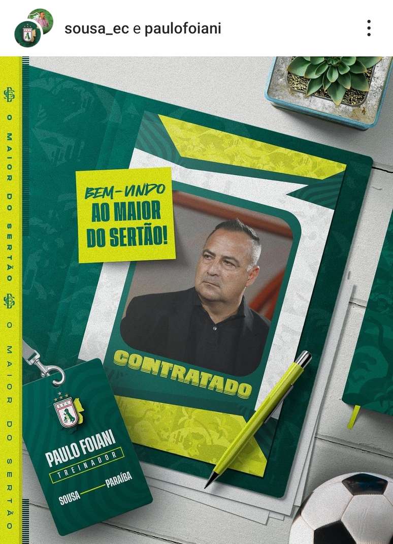 "Aos torcedores do Sousa Esporte Clube, aqui é Paulo Foiani, seu novo treinador. Agradeço ao presidente Aldeone Abrantes pela grande oportunidade de comandar essa grande equipe do Nordeste e uma das grandes do Brasil. Conto com o apoio de todos vocês", comemorou o técnico em vídeo divulgado pelo time nas redes sociais.