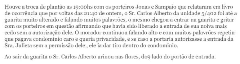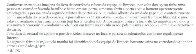 O condomínio apresenta lista com mais de 50 ocorrências envolvendo Carlos Alberto entre junho de 2019 e março de 2023.