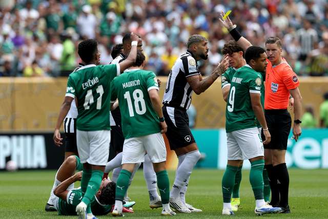 Muita reclamação de jogadores do Palmeiras depois de uma entrada violenta de Barboza. Time alviverde queria o vermelho para argentino, que poderia ter complicado a situação dos cariocas.