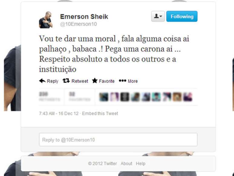 Titular do Corinthians na campanha vitoriosa do Mundial de Clubes da Fifa de 2012, o atacante Emerson ficou cinco dias sem tecer comentários no Twitter. Neste domingo, horas após a vitória por 1 a 0 sobre o Chelsea, na final do torneio disputado no Japão, ele voltou ao site e, em vez de comemorar a conquista, esbravejou e disparou xingamentos.