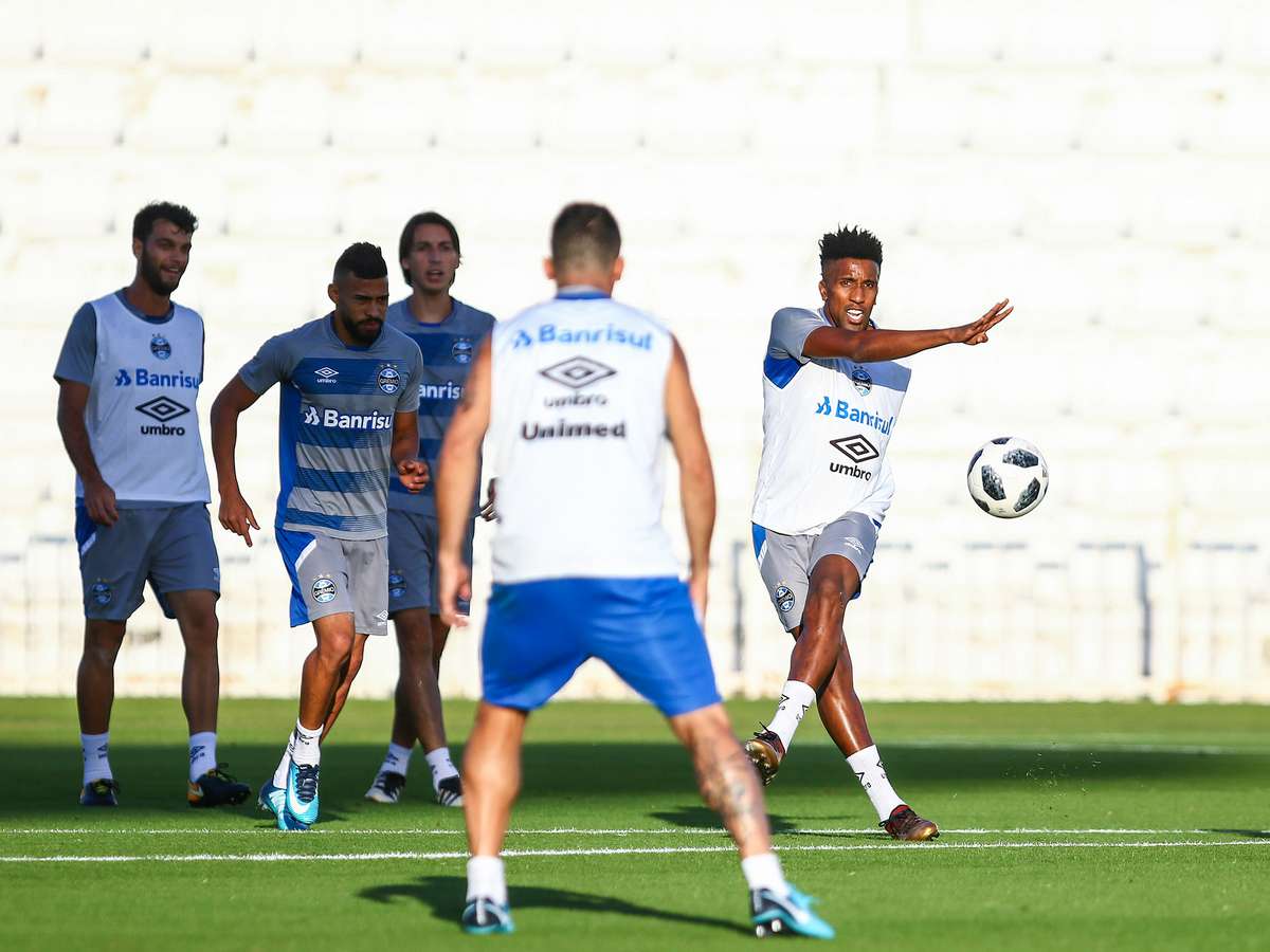 Após treino, o grupo fez o reconhecimento do gramado do estádio Hazza Bin Zayed, local em que vai ocorrer a partida desta terça-feira. O provável time da estreia no Mundial deve ter a seguinte formação: Marcelo Grohe; Edílson, Pedro Geromel, Walter Kanneman e Bruno Cortez; Jaílson, Michel, Ramiro, Luan e Fernandinho; Lucas Barrios.